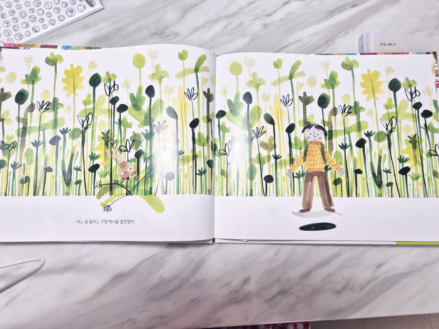 <어느 날 길에서 작은 선을 주웠어요>가 선을 중심으로 간략하게 그려진데다가 여백이 넓었던 것과 비교할 때 <구멍을 주웠어>의 그림은 수채화 느낌으로 채색이 되었고 펼친쪽 양면을 적절하게 활용하는 방식이다.