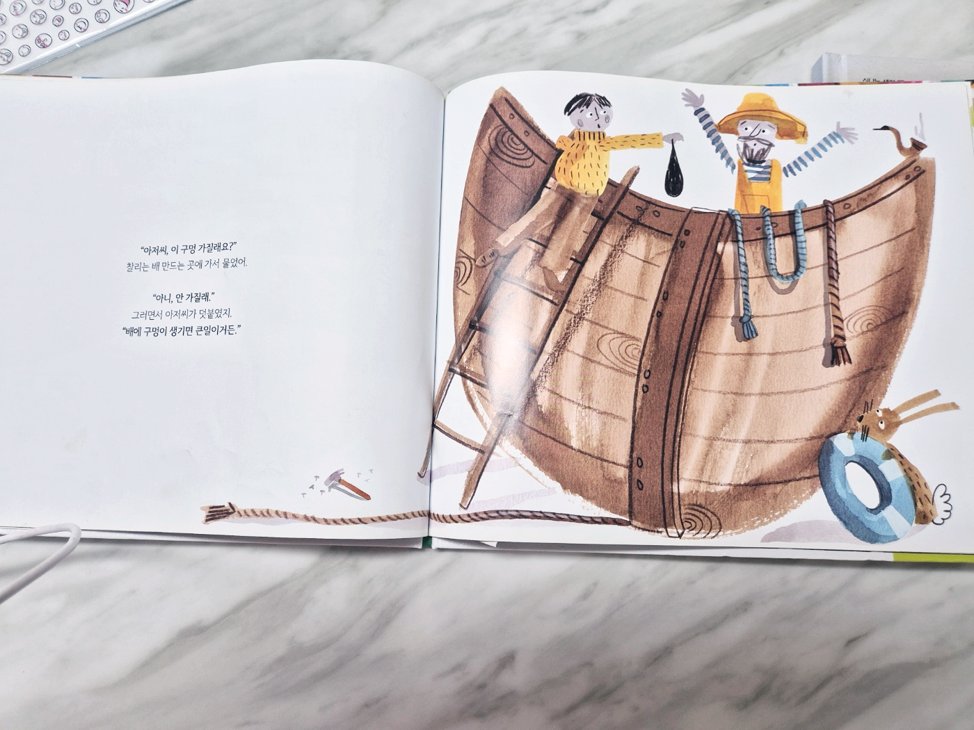 한편, <구멍을 주웠어>는 역시 한 아이가 우연히 구멍을 줍는다. 그런데 이 구멍은 아이의 일생을 관통하지는 않는다. 구멍은 주워담기만 하면 주머니나 가방을 구멍내고 그 안의 물건을 쏟아내는 통에 천덕꾸러기 신세다. 그래도 아이는 그것이 필요한 사람을 찾아 다닌다. 그 과정에서 우리 주변에는 수많은 구멍이 있고 구멍들은 제각각 일을 하고 있음을 발견한다. 비록 자기에게는 쓰임이 없지만 누군가에게는 쓰임이 있을 것이라는 것을 알려준다.