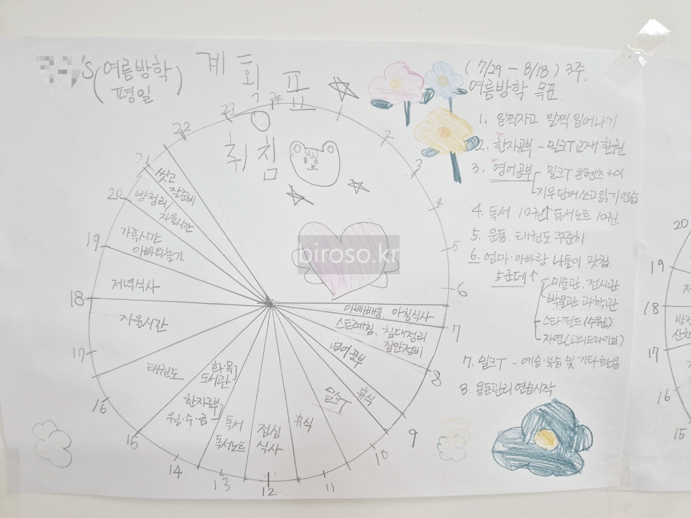 드디어(라고 쓰고 결국이라 읽는다.) 여름방학이 시작되었다. 우리 아이의 학교는 이번 여름방학이 3주 정도로 짧은 편이다. 지난 겨울방학의 시간표 활용이 어느정도 효과가 있어서 이번 여름방학에도 시간표를 만들었다. 아이와 함께 시계를 그리고 일어날 시간과 잘 시간을 정하고 학원, 스마트학습지 하는 시간 등 평소 루틴하게 해야 하는 일정을 넣고 나머지 방학에 보충하고자 하는 내용을 상의해서 작성하였다.