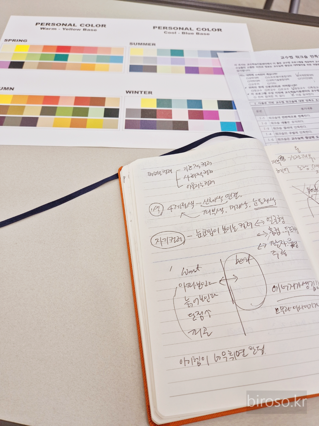 강사님은 수강하는 분들을 일일이 컬러 인쇄된 종이를 나눠 주시고 웜, 쿨을 나누어 얼굴과 대비하여 어울리는 정도를 진단해주셨다.