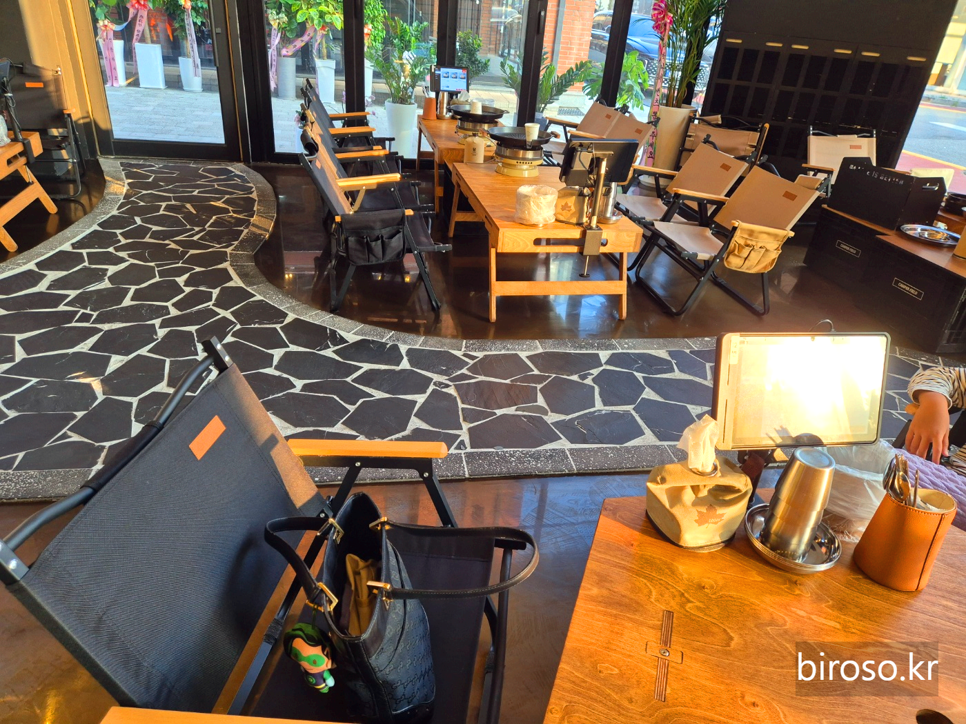 테이블은 단체, 가족단위로 즐길 수 있도록 준비되어 있었다. 우리는 가운데 팔각형 자리에 앉았는데 중간자리라서 다소 뻘쭘해도 공간을 충분히 즐길 수 있다는 장점도 있었다. 주방도 가깝고 셀프코너도 가깝고 모닥불 조형물하고도 가까워서 기분내기도 좋았다.