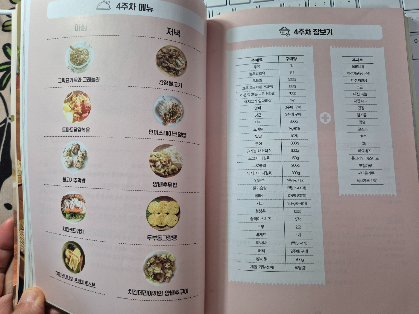 한 주 씩 식단을 제시하고 그에 필요한 장보기 재료를 알려준다. 이 때 메뉴 사진을 한데 모아서 보여주어서 전체 개요를 간단하게 확인할 수 있게 해주어 좋았다.