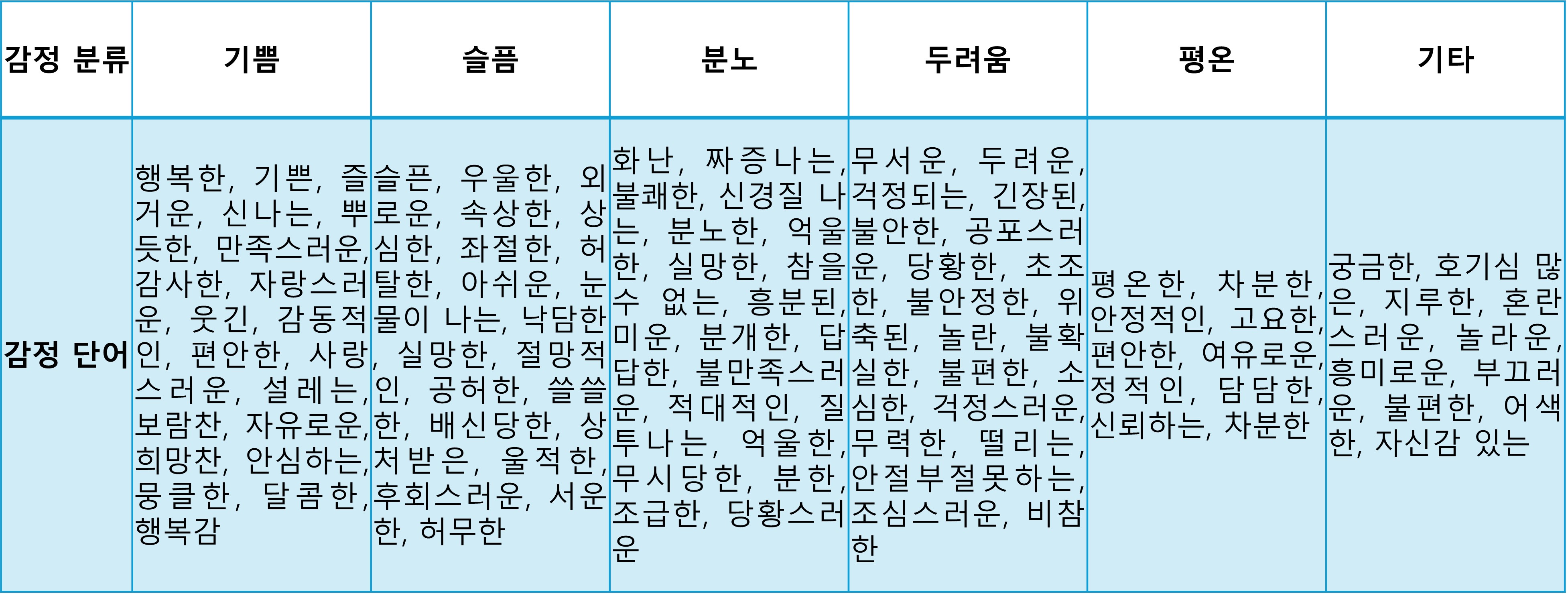 감정에 따른 감정 단어 100가지를 정리해서 다음과 같이 표로 만들었다.