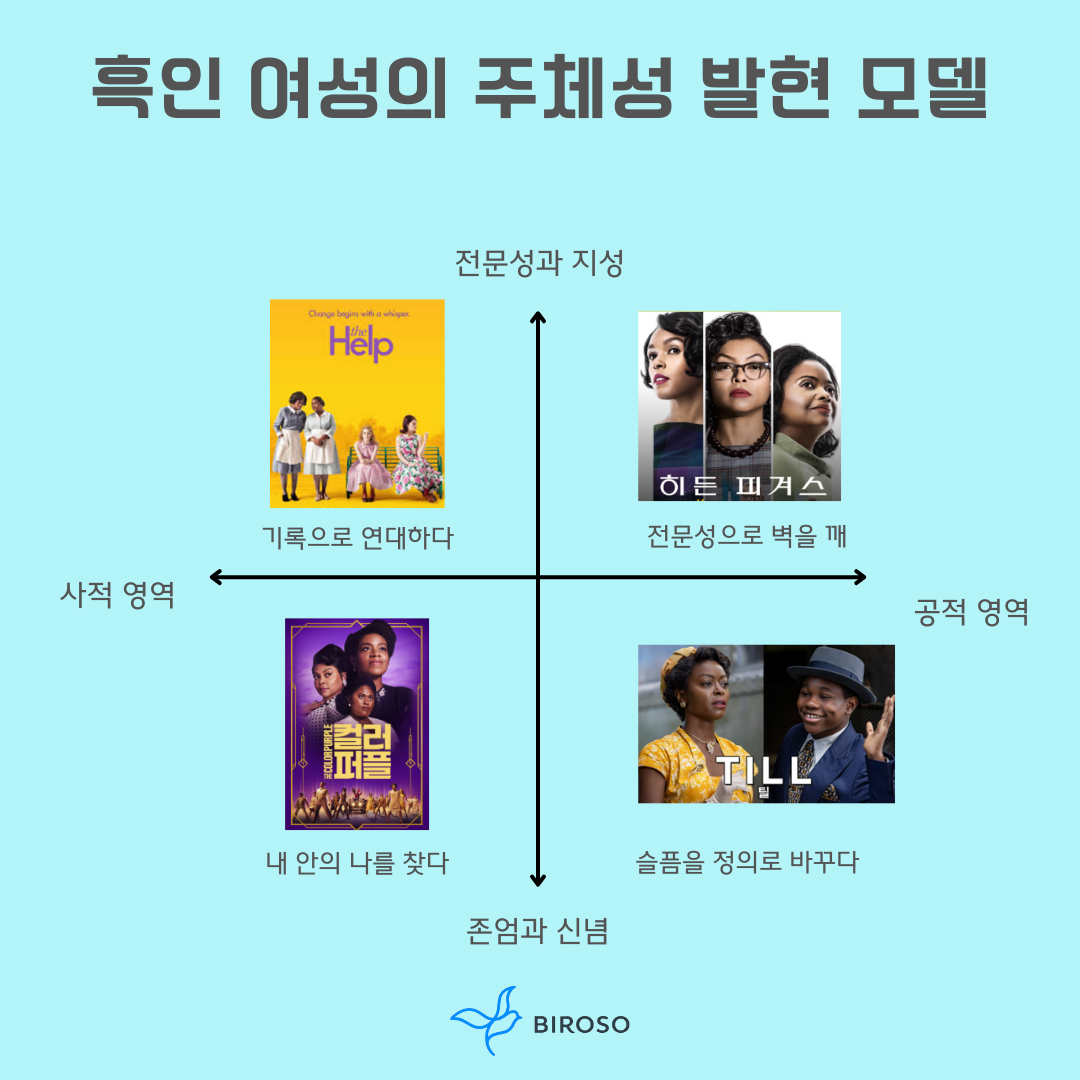 우리는 이 영화들을 보며 흑인 여성들의 과거를 동정하는 것에 그쳐서는 안 된다. 지금 내가 사는 지금 여기 최근까지도 아시아 여성으로서 우리가 마주한 유교적 관습과 유리천장 역시 그녀들이 마주했던 벽과 모습은 다를지언정 그 궤를 같이하기 때문이다. 그래서 어떤 영화는 내면의 목소리를 찾는 길을 알려주고, 어떤 영화는 세상을 향해 전문성으로 답하는 법을 가르쳐주는 것이다.