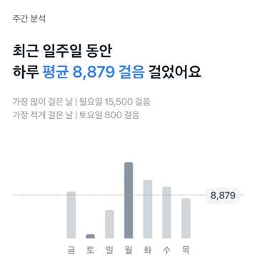 하루 하루 걸었던 걸음 수는 한데 모아서 볼 수도 있다. 만보 걷기로 마음 먹은지 딱 1주일 되었는데 주말에도 의식적으로 많이 움직여야겠다고 마음먹게 되었다. 평균 8879걸음 걸었고 오늘은 좀 더 채우면 평균은 올라갈 예정이다. 달력에는 만보 이상 걸었던 날을 표시해서 알려준다.