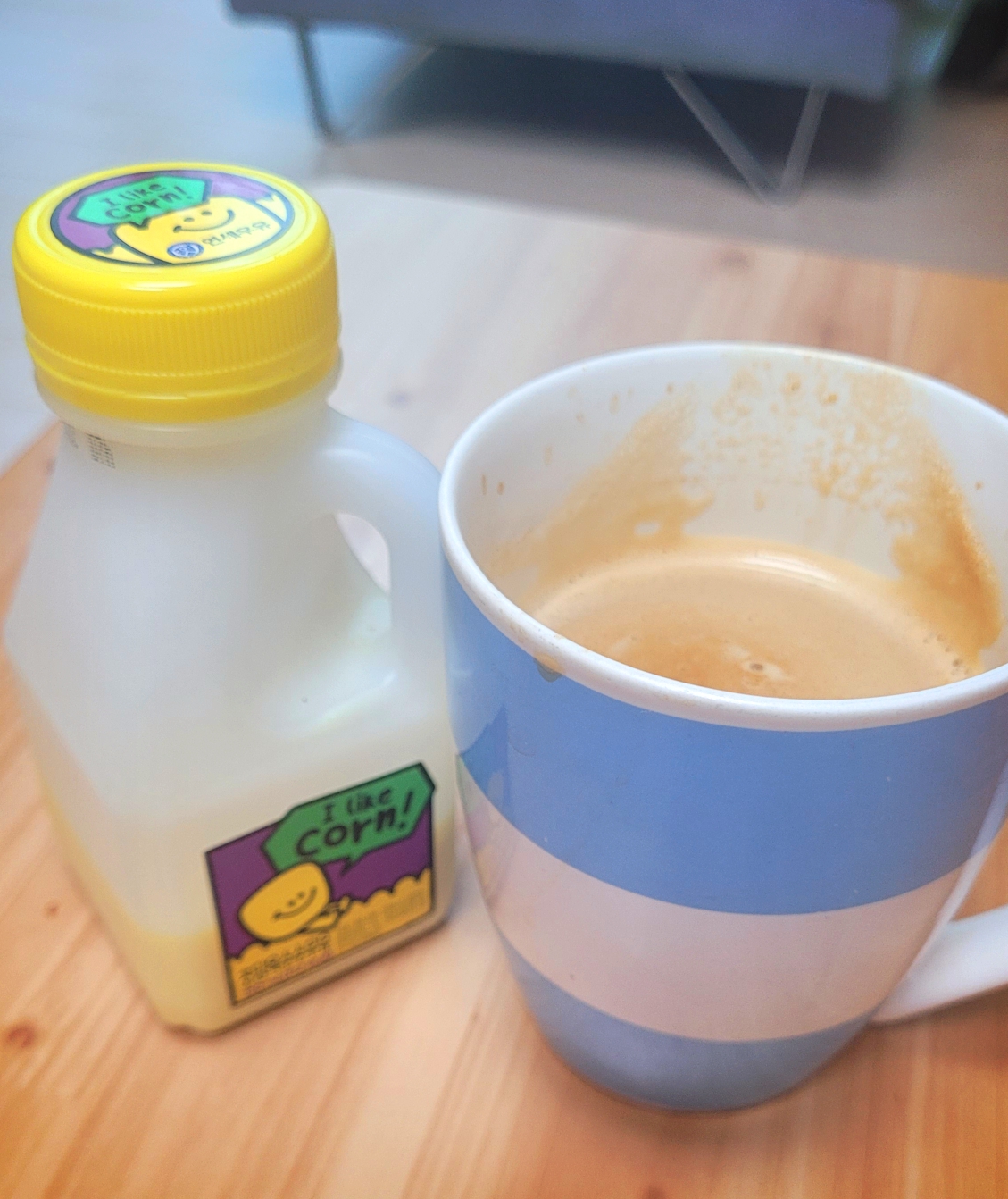 아침 캡슐커피내려서 라떼하려고 냉장고 문열었더니 초당옥수수우유가 눈을 맞추네요.