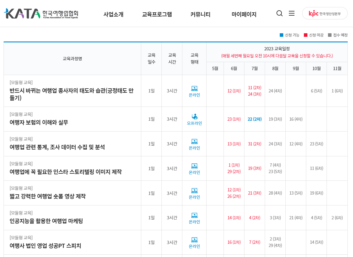 한국여행업협회(KATA)가 무료 디지털 교육을 제공하기에 이번참에 '여해상품 개발을 위한 디지털 기획력'과 '여행상품 기획' 수업을 수강하였다. 비대면 실시간 인터넷 강의로 진행되어 시간만 맞다면 좋은 교육을 무료로 받을 수 있다. https://www.edu-kata.or.kr/ 에 들러보면 온오프라인 교육 정보를 열람하고 회원가입 없이도 간단히 교육을 신청할 수 있다.