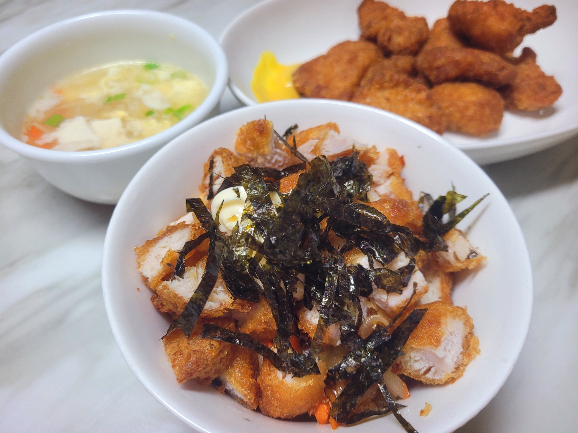 3. 따뜻한 밥을 담고 2번의 곁들임을 넣고 소바바치킨을 먹기 좋은 크기로 잘라서 담아준다.