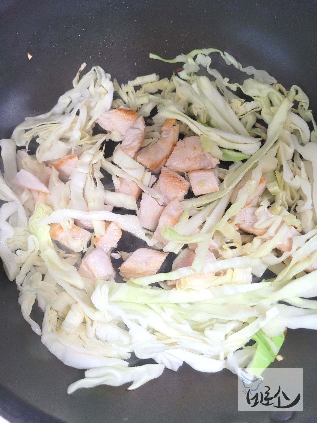 2. 닭가슴살 부피 정도(주먹크기만큼)의 양배추를 채썰어서 프라이팬에 함께 볶는다.