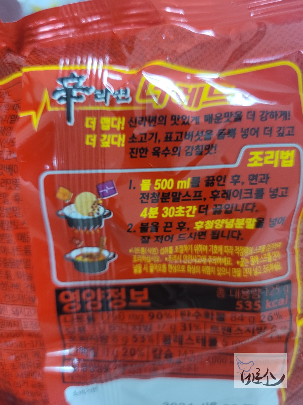 같은 농심에서 나온 너구리 순한맛의 영양정보와 비교해볼 수 있게 사진을 찍어 두었다. 너구리는 505kcal로 신라면 더레드에 비해 총 내용량(후첨스프용량 차이?)부터 영양정보면에서 대부분 조금씩 적게 들었다. 특히 나트륨은 하루 권장량의 74%로 신라면보다 준수한 편이다.