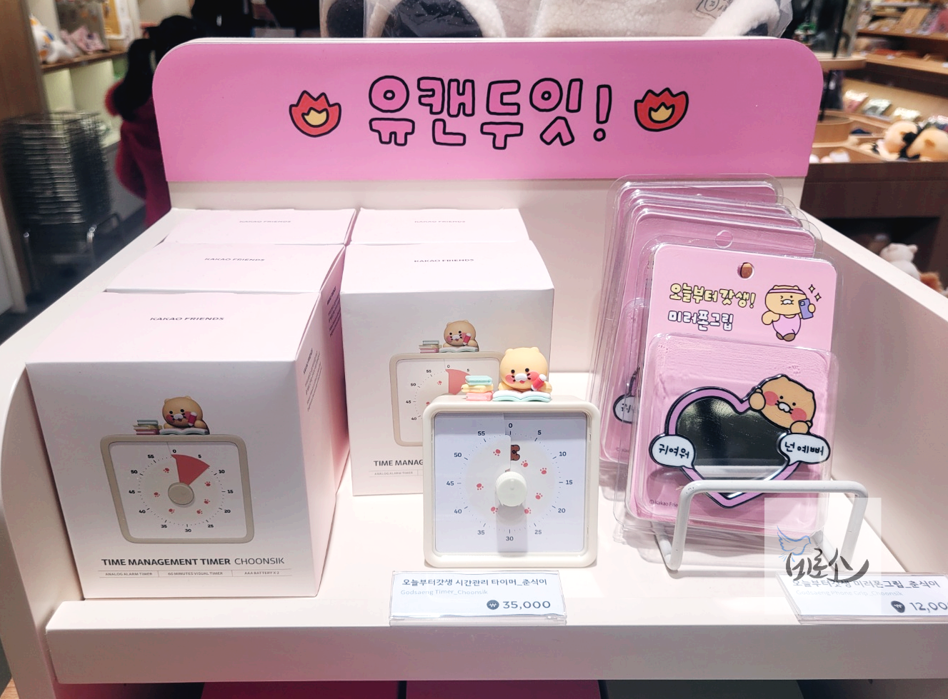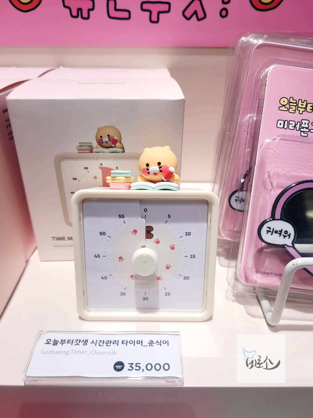 그 외에도 카카오 프렌즈의 캐릭터를 이용한 일상에서 활용하기 좋은 갓생 아이템들도 보였다. 시간관리를 위한 타이머가 보였는데 시간을 정해두고 학습을 하거나 운동을 하는 등 루틴을 만들 때 활용해보면 좋을 오늘부터 갓생 시간관리 타이머와 매일 자기 얼굴을 보면서 갓생을 다지는 미러폰그립이 있다.