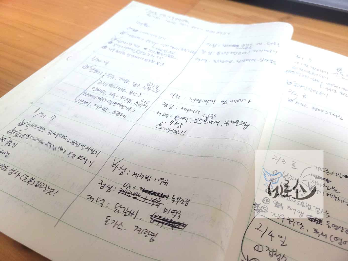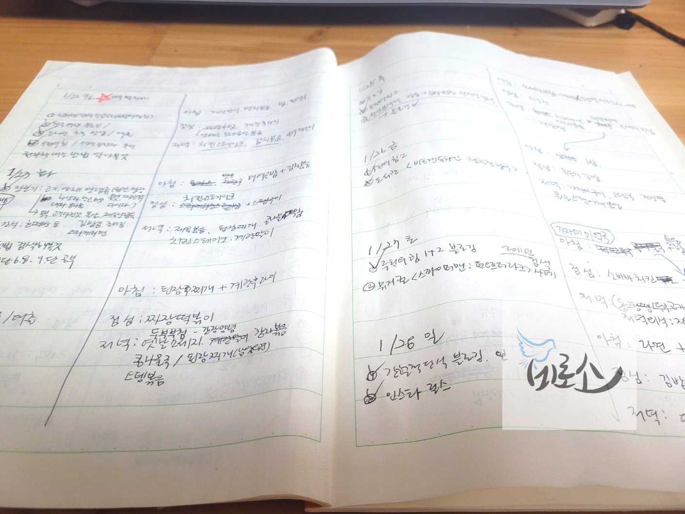 식탁에 올려두고 그날그날 해야 할 일과 식단을 정리했다. 식단만 따로 적는 노트나 포맷을 만들어서 활용해야겠다는 생각을 했다. 그날 해야 하는 일은 개인적인 것과 가족 모두에 해당하는 것을 함께 써서 개인 다이어리와는 조금 다른 쓰임으로 메모의 개념으로 활용한다.