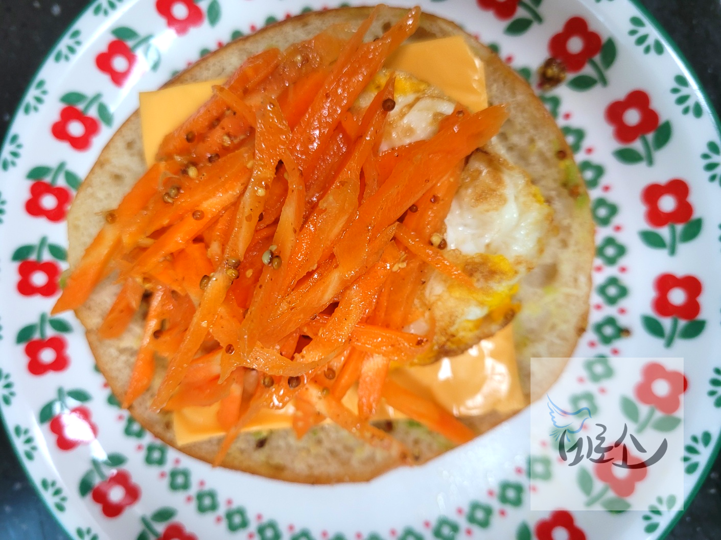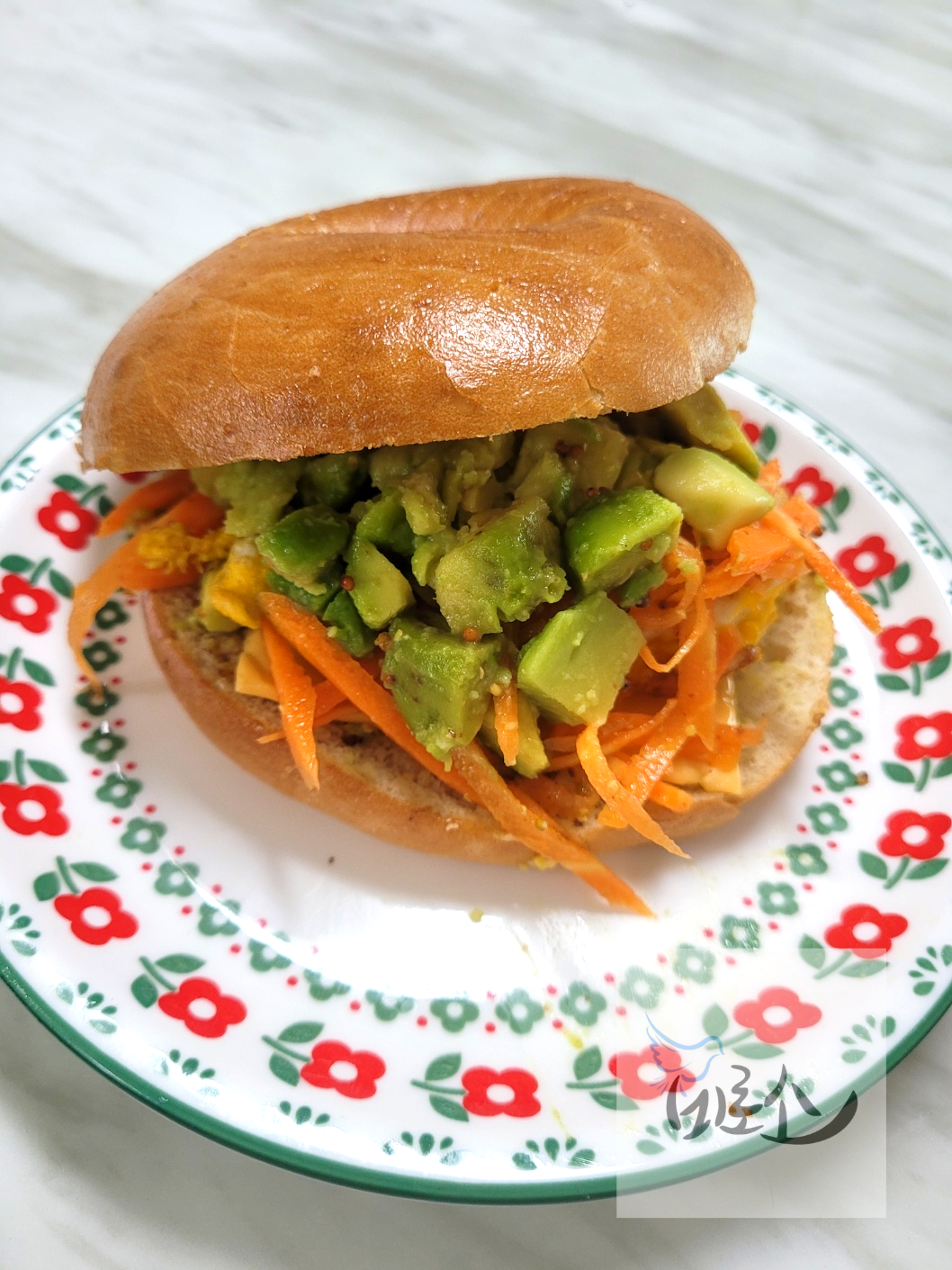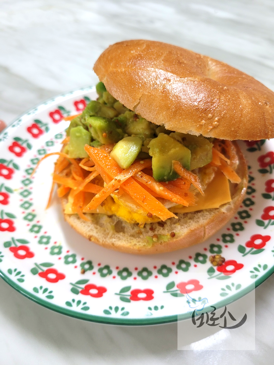 본격적으로 샌드위치도 만들어 먹어 보았는데 당근에 올리브유 코팅이 되어 윤기가 흐르다보니 더 먹음직 스러워 보였다. 거기에 보색인 초록색 아보카도를 곁들이고 단백질로 치즈, 달걀후라이를 얹으니 조금은 헤비한 베이글 샌드위치가 만들어졌다.