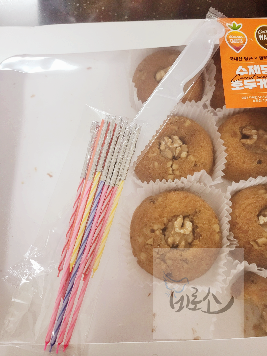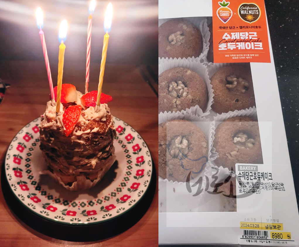 생일 주간이라서 딸기 생크림 케익도 하나 살까 하다가 이걸 샀다가는 혼자 다 먹게 될 것 같아서 주춤했다. 그런데 옆에 수제당근호두케이크가 먹음직스러운 자태로 데려가라고 말하는 것 같았다. 구움도넛같은 비주얼에 호두가 총총 박힌 모습이 정말 맛있어 보이는데 16개가 들었는데 가격이 8980원, 만원이 채 되지 않았다. 당근케잌을 좋아해서 스타벅스 당근케잌도 너무 좋아하는데 여기에 호두까지 총총 박혀있으니 안살 이유가 없었다.