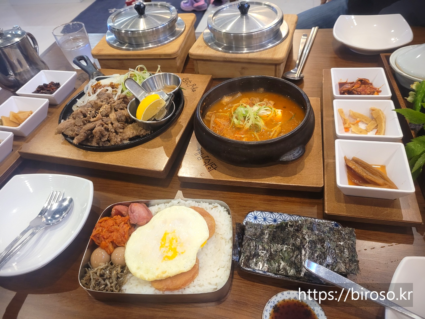 마른 김은 테이블 한편에 준비가 되어 있어서 먹을만큼 덜어서 먹으면 되고 해남에서 온 묵은지로 끓인 김치찌개는 내 취향과 맞아서 좋았다. 추억의 도시락은 구성이 충실한 편이라서 메인 소불고기와 함께 아이가 실컷 배불리 먹었다.