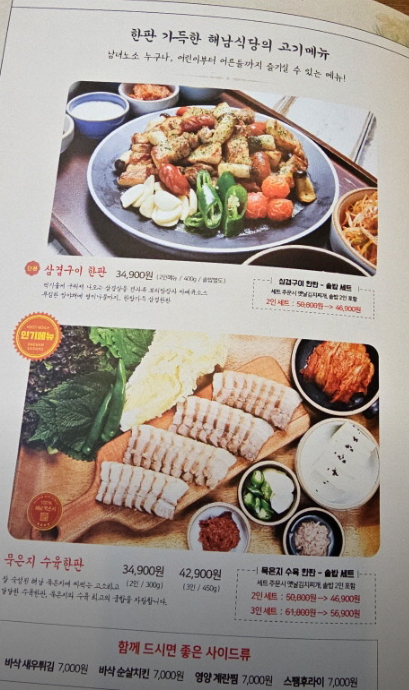 메뉴는 구이, 찌개, 볶음, 수육, 세트 메뉴와 사이드 메뉴로 다양하다.