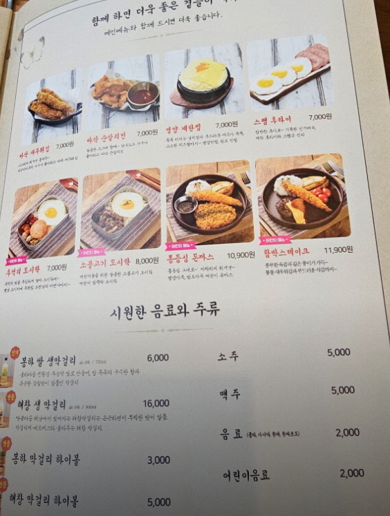 삼겹구이, 수육도 있어서 가족 모임에서 술안주로도 제격인 메뉴도 마련되어 있다. 새우튀김이나 순살치킨, 계란찜 등도 있어서 곁들여서 한상 푸짐하게 구성할 수도 있다.