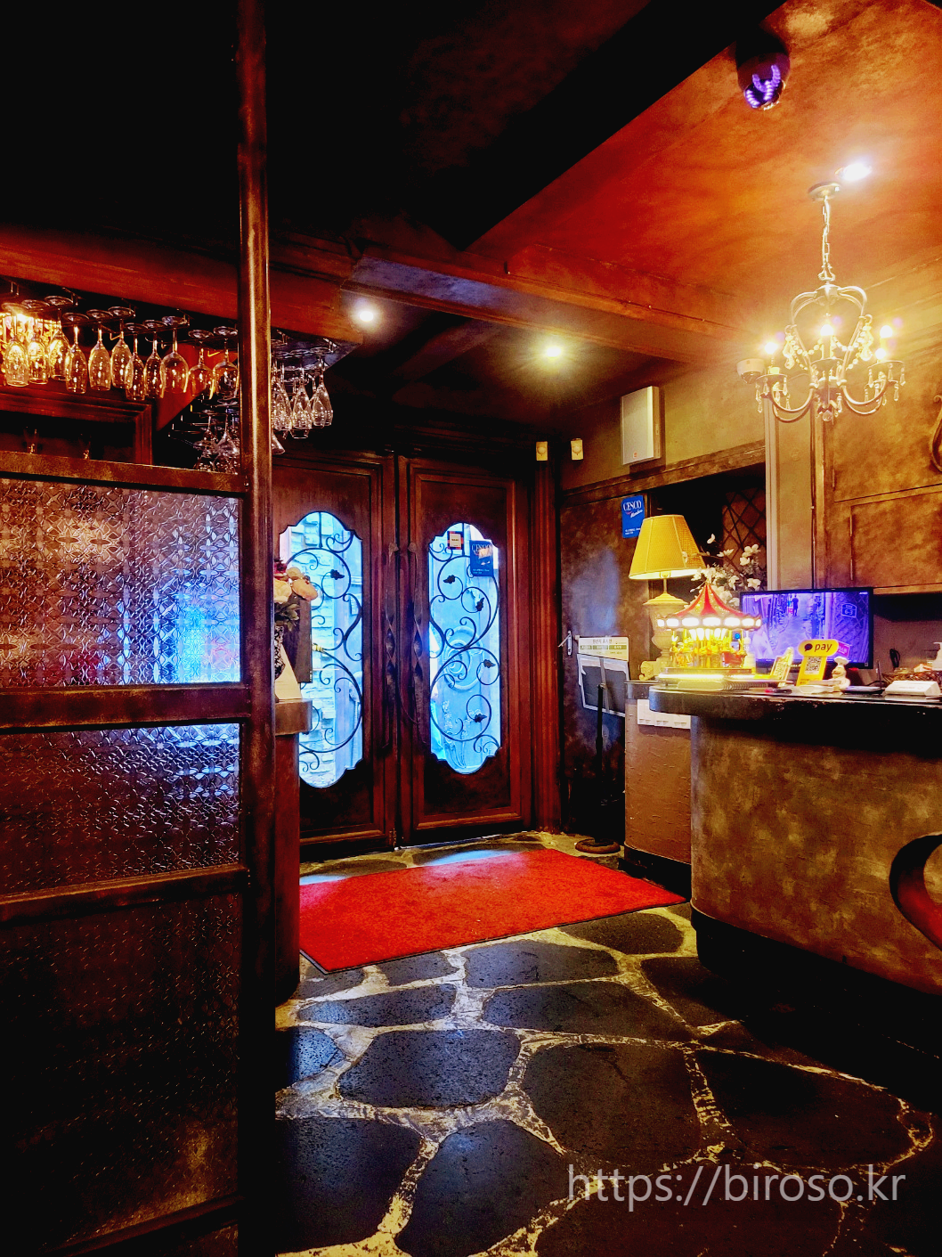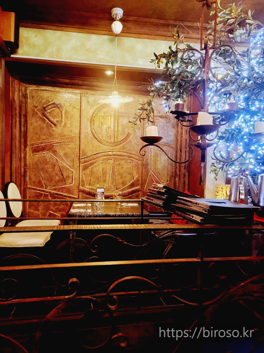 내부 인테리어는 다소 어둡다. 조명은 따뜻한 주황색이고 등이 낮게 걸려있어서 각 테이블의 조명빨이 좋은 편이다. 데이트하고 서로에게 집중할 수 있는 분위기를 만들어준다. 주변의 소품이나 커다란 샹들리에는 특유의 오랜 빈티지 경양식 집의 분위기를 자아낸다.