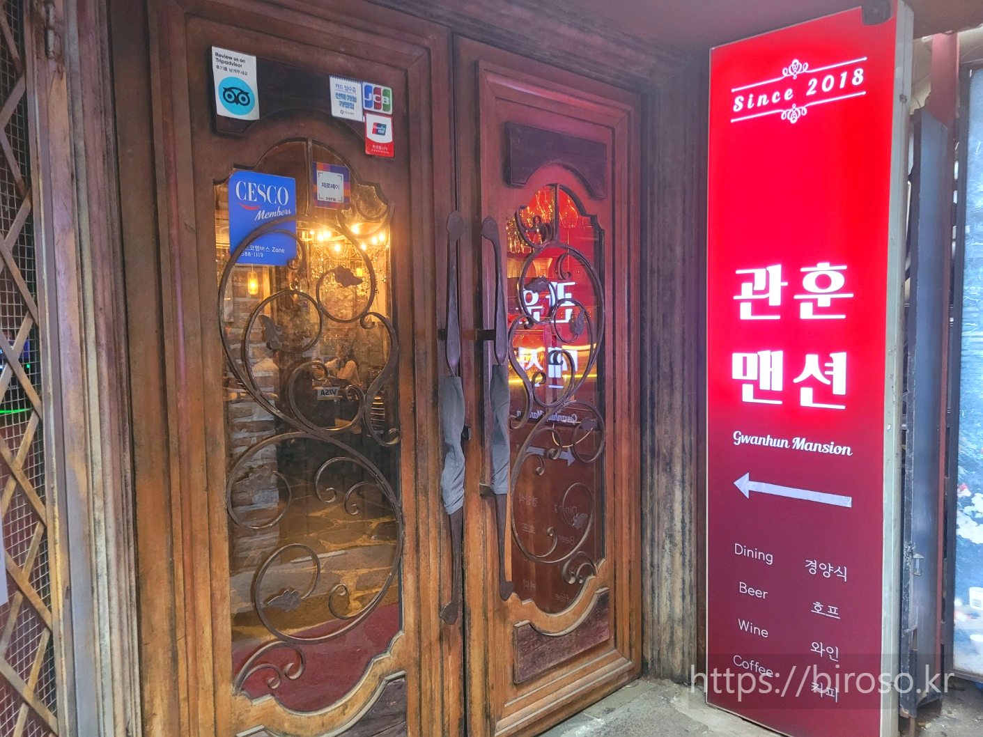 나같은 사람이 많았나보다. 저 멋스러운 입구와 내부 인테리어와 전혀 어울리지 않는 간판과 메뉴 전시대라니. 생각보다 역사가 길지 않은 since 2018이라는 문구에 관훈맨션이라는 큼직한 글씨에 경양식, 호프, 와인, 커피라는 글씨가 보였다. 왠지 좀 안심이 되는 느낌이다. 1988에서 정봉네가 외식했던 그런 곳인가 싶은 예감이 들었다.