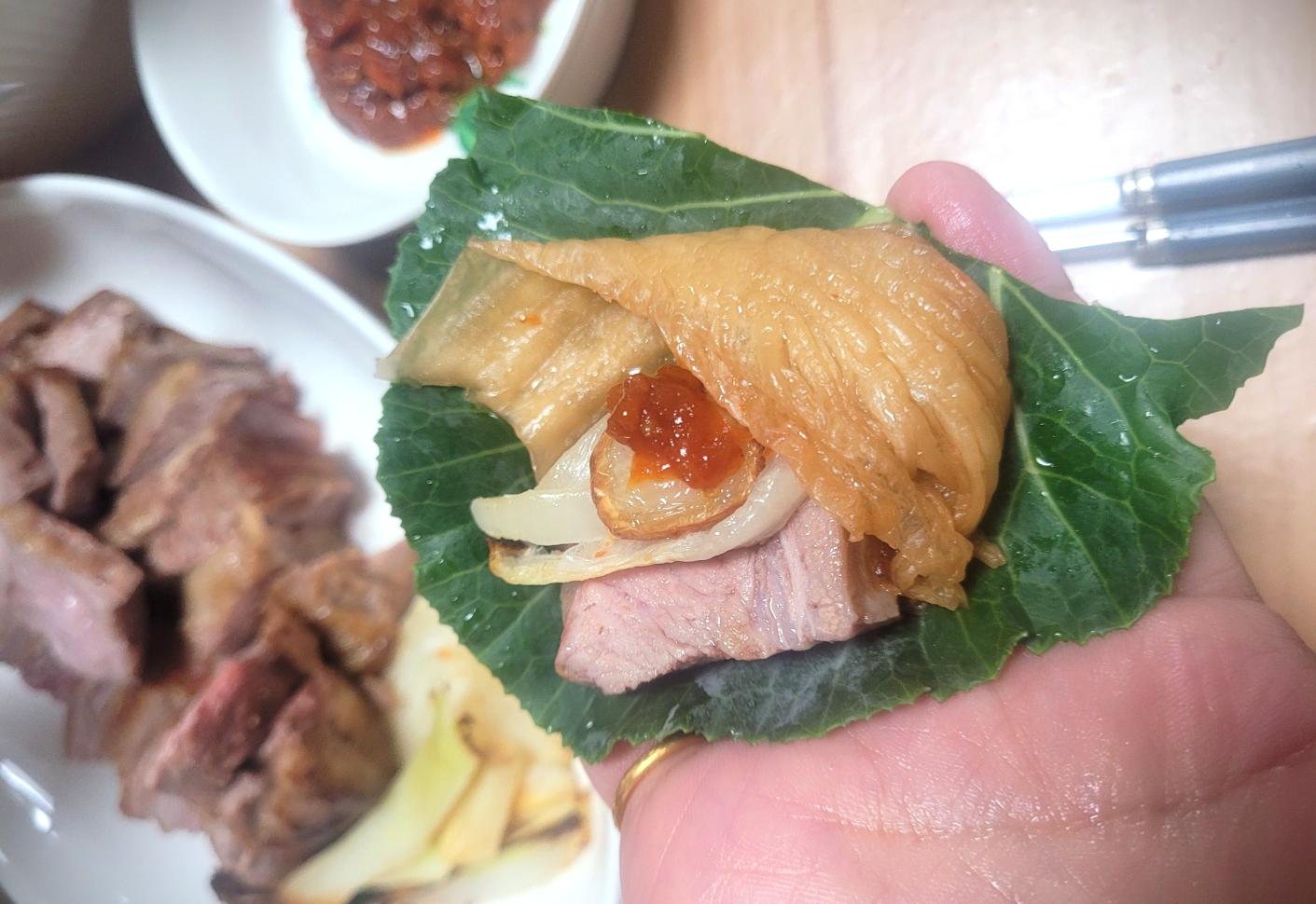 냄새도 나지 않고 고기 굽느라 번잡스럽지 않게 고기 한 근을 한 번에 썰어 내었더니 남편은 결과물의 맛에는 만족스럽지만 엄밀히 말하면 수육은 아니라고 선을 그었다. 어허 참.