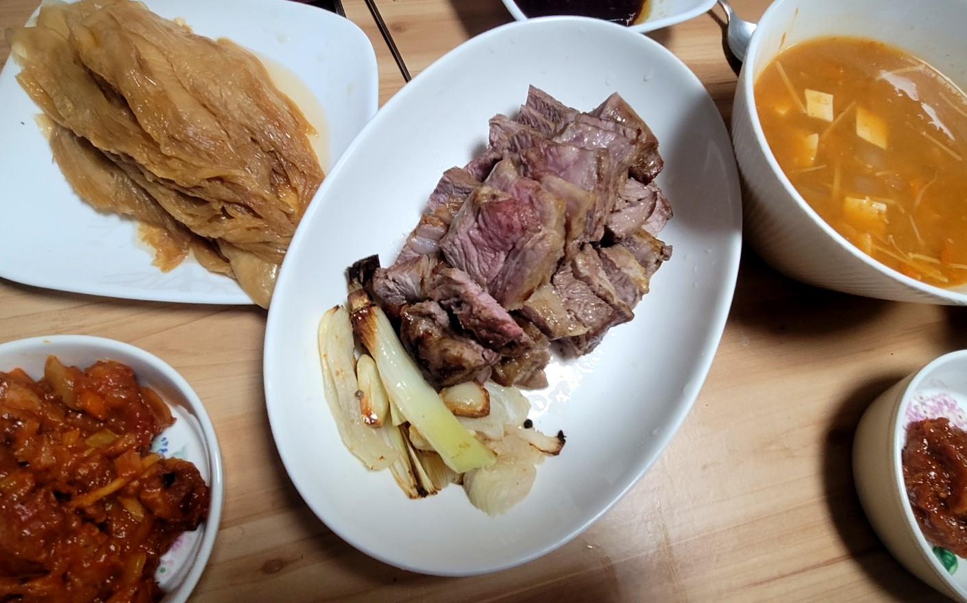 처음 고기 깔고 돌리는 것 외에 나의 노동력은 들어가지 않았으므로, 고기가 익을 때까지 곁들일 이런저런 것들을 준비하면 된다. 밥도 앉히고 쌈장이나 밑반찬 그릇에 담고, 이수영의 평생된장찌개도 끓이고, 묵은지도 씻어서 참기름에 양념을 조물딱 무쳐 내고, 모듬쌈 구성지게 씻어 내면 구색이 맞춰진다.